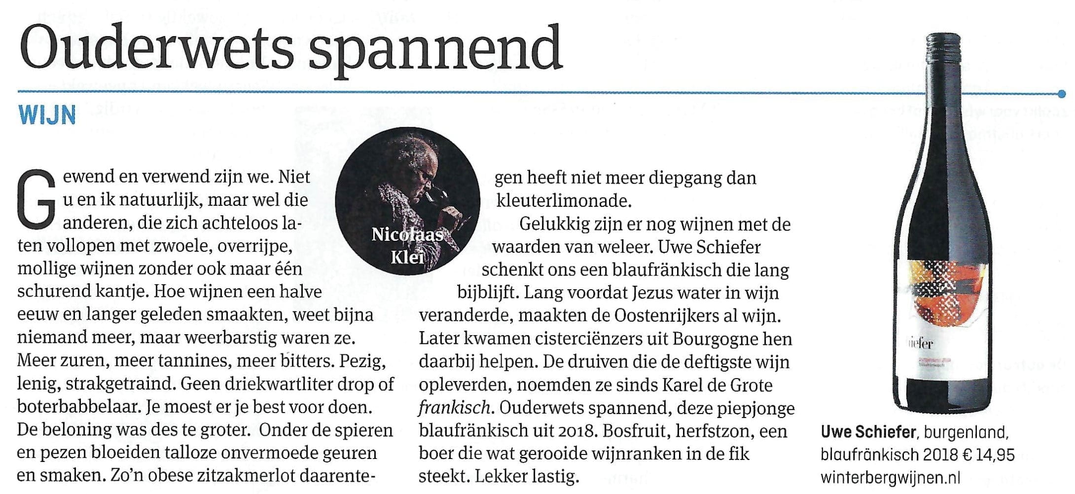 Naar aanleiding van de column van Nicolaas Klei nieuwsgierig geworden naar deze “ouderwets spannende” en “lekker lastige” Blaufränkisch Burgenland van Uwe Schiefer? Graag sturen we je voor € 89,70 een proefdoos met 6 flessen van deze wijn toe.